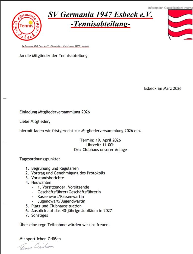 Nach der Versammlung können wir uns dann bei einem Imbiss stärken und, bei hoffentlich bestem Tennis-Wetter, auf die Plätze gehen.