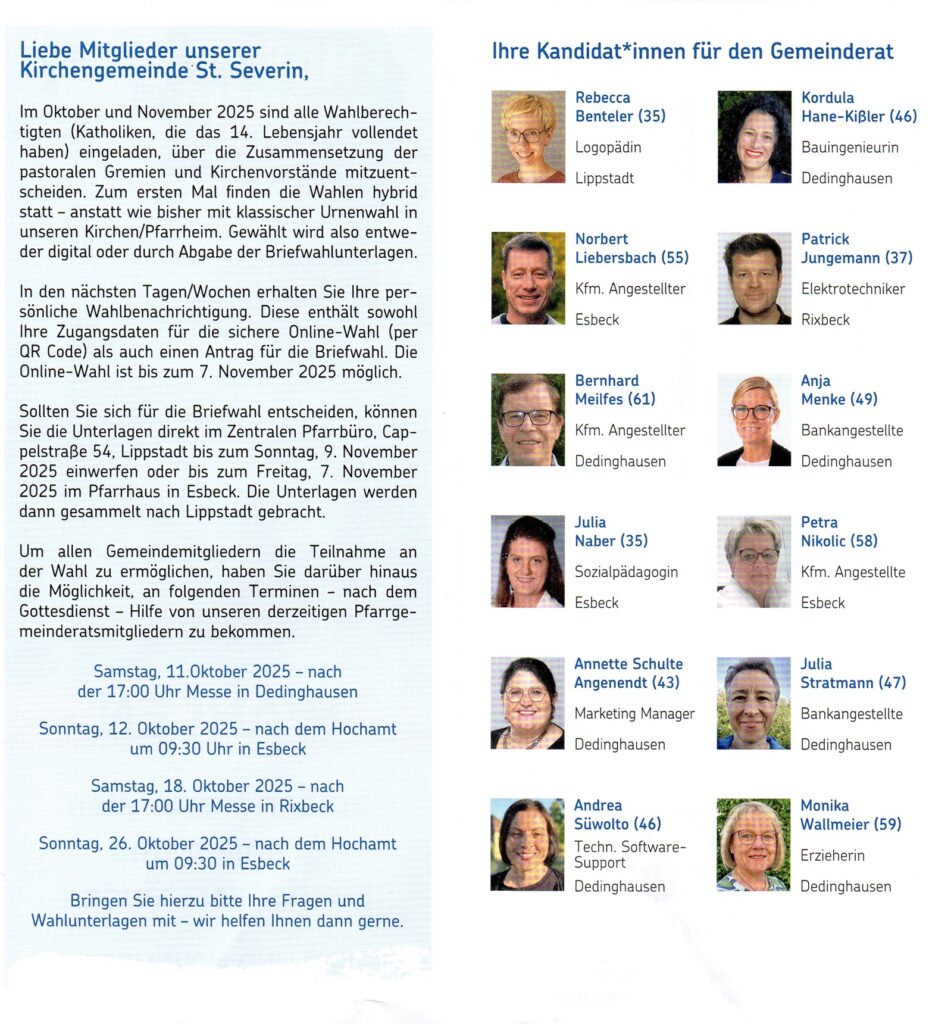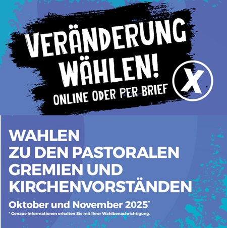 Ab Mitte Oktober erhalten alle Wahlberechtigten ihre persönliche Wahlbenachrichtigung. Diese enthält sowohl die Zugangsdaten für die sichere Online-Wahl als auch einen Antrag für die Briefwahl. Die Online-Wahl ist bis zum 7. November möglich, die Frist zur Abgabe der Briefwahlunterlagen endet in unserem Pastoralen Raum am Sonntag, 9. November.