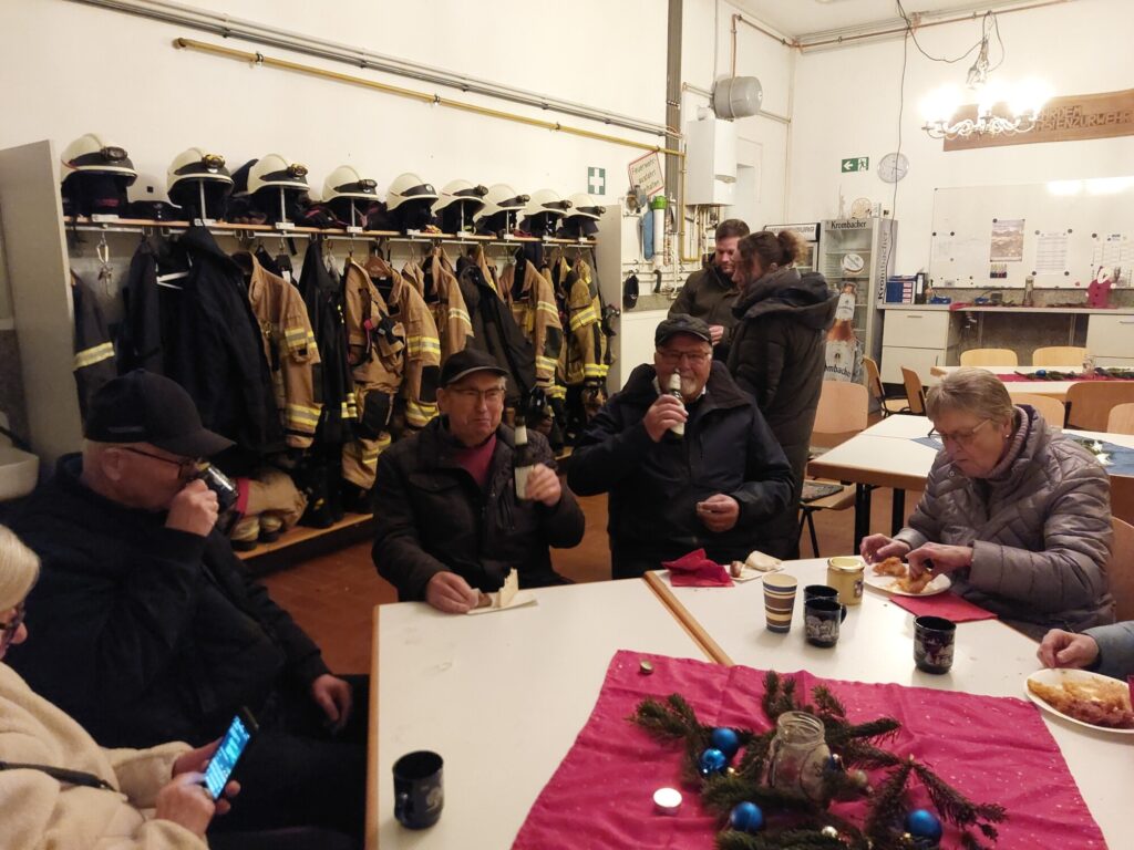 Traditionelles Weihnachtsbaumaufstellen am Treffpunkt durch die Kameraden der Feuerwehr Esbeck.