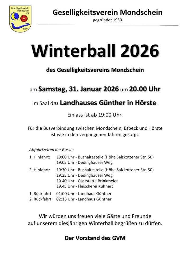 am 31. Januar 2026 feiern wir mit unserem Königspaar Hubertus und Sarah Dietz sowie ihrem Hofstaat unseren diesjährigen Winterball. Hierzu laden wir euch alle herzlich ein. Die Feier beginnt um 20.00 Uhr im Landhaus Günther in Hörste.